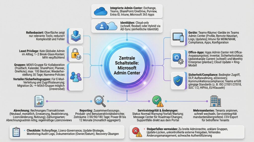 | Microsoft 365 Admin Center | Benutzer, Lizenzen, Gruppen, Rollen, Abrechnung, Health, Berichte | Dein Dreh- und Angelpunkt für das Tagesgeschäft und Überblick |