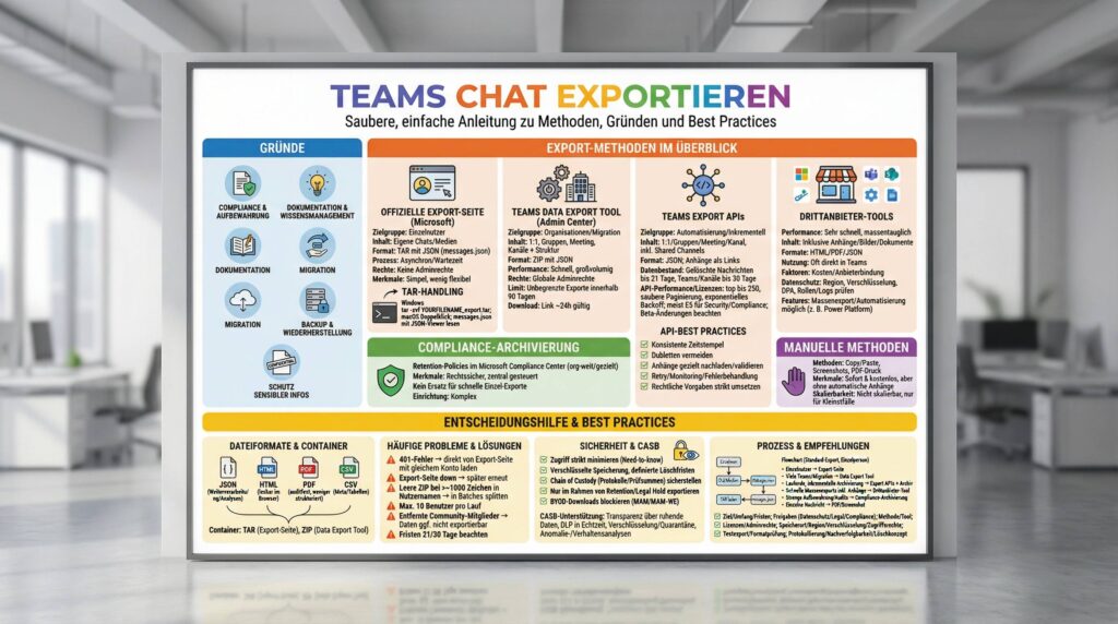 | Drittanbieter-Tools (z. B. Teams Chat Exporter) | Business-User, Fachbereiche | Komplette Chats inkl. Anhänge, Massenexport | HTML, PDF, JSON (je Tool) | Sehr schnell | Tool-Lizenz, ggf. App-Install | Einfach, DSGVO-konform, massentauglich, direkt in Teams | Kosten, Anbieterbindung |