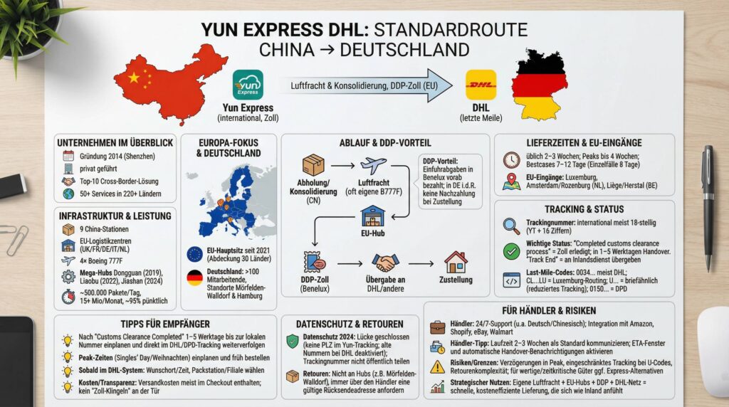 | Handover an Deutschland | Yun Express → DHL/Hermes/DPD/Deutsche Post | Übergabe ans Inlandssystem |